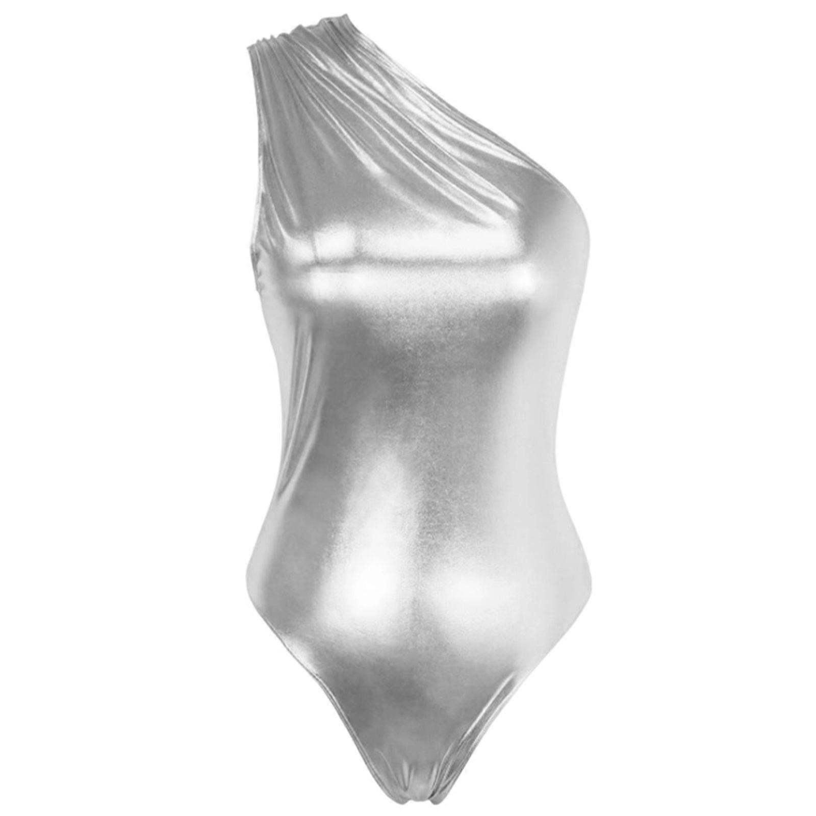 Glitter Metallic One pieced Bodysuits Shines Dance Leotard Sleeveless One Shoulder Bodysuit Rave Club Outfits for Women silvery white XL