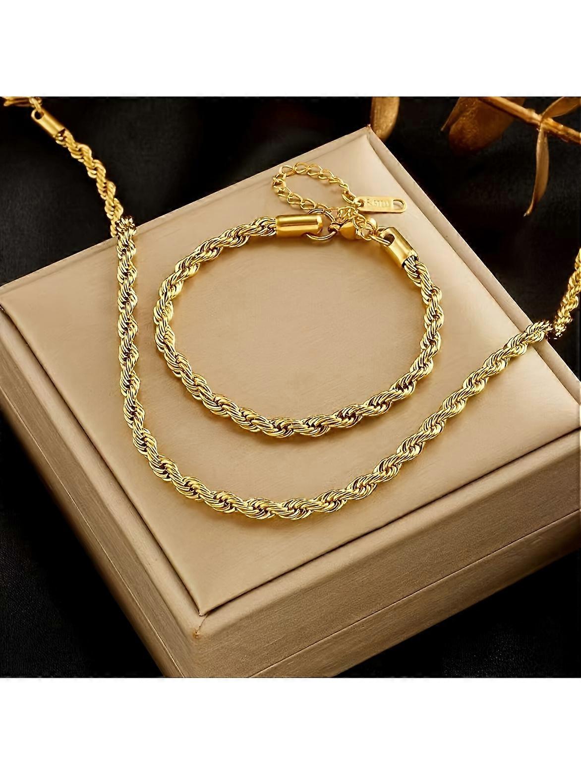 2PCS Gold Color Stainless Steel Necklace Bracelet Set, Elegant And Simple Design, Ladies Couple Holiday Party Accessories