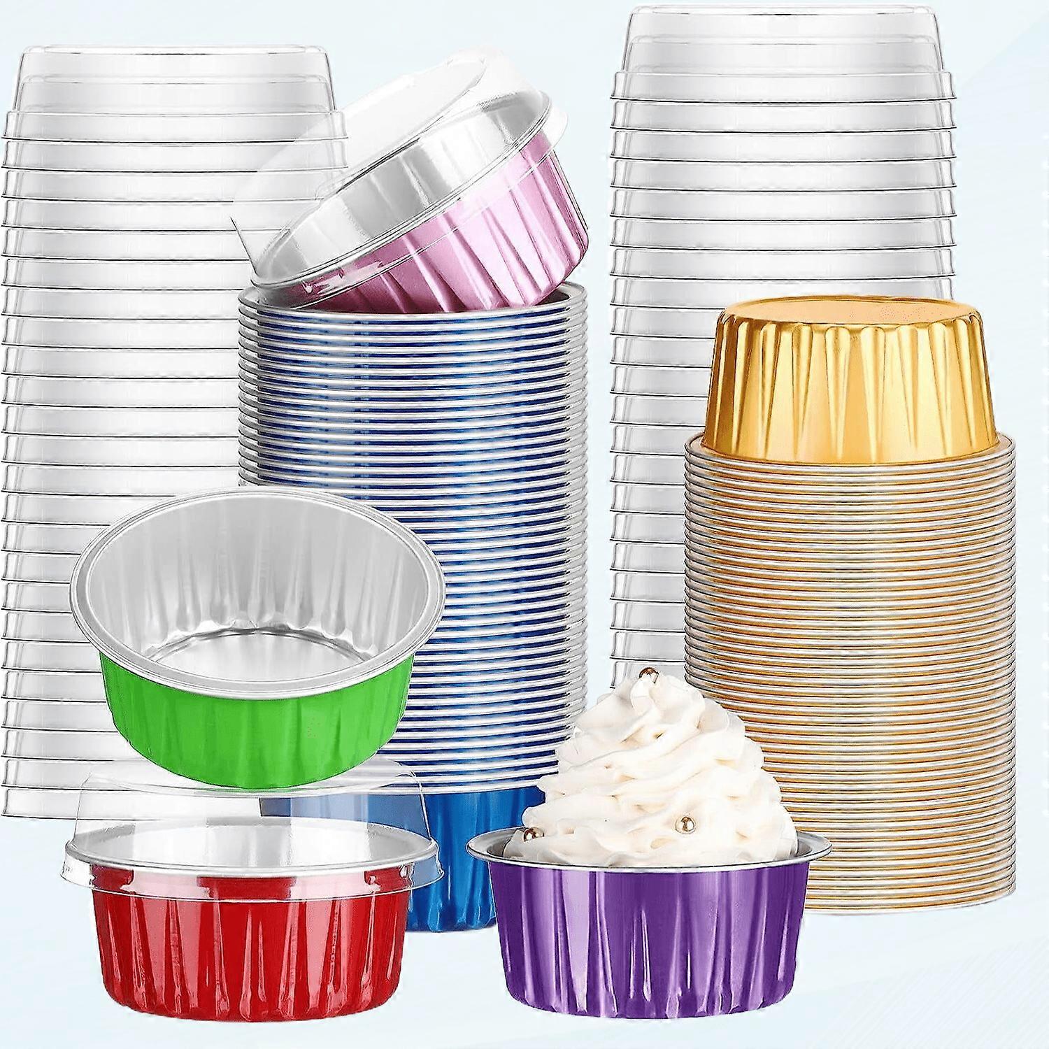 150 Pcs Aluminum Foil Baking Cups with Lids, 5 oz Disposable Ramekins for Desserts, Muffin Tin, 6 Colors, Compatible with Standard Molds