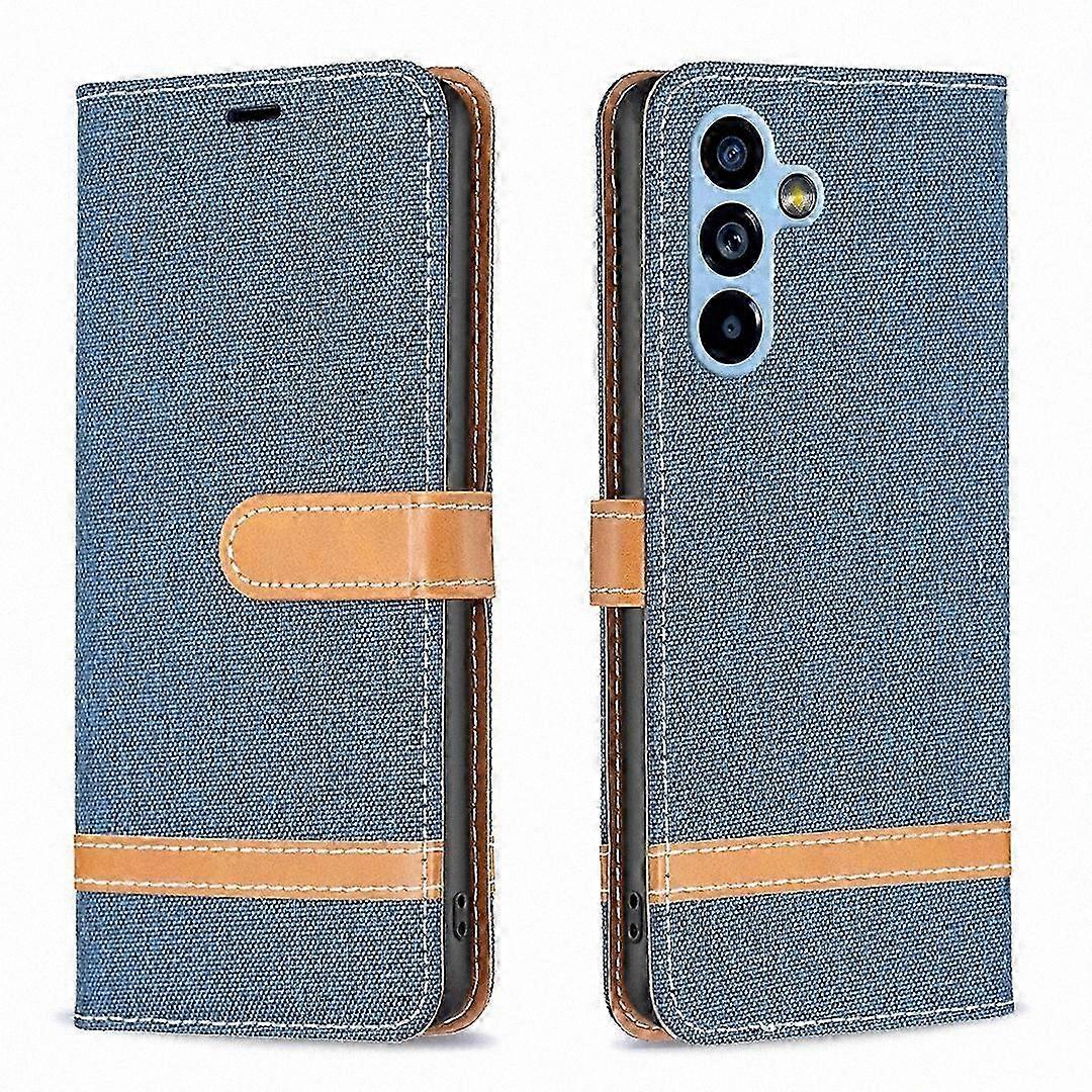 For Samsung Galaxy A54 5G Color Block Denim Texture Leather Phone Case 1. Made of PU leather and TPU material for long-lasting use. 2. Provides protection against everyday scratches, dirt, tears, and wear. 3. Built-in stand enables convenient horizontal viewing. 4. Features card slots, wallet functionality, and a lanyard loop. 5. Precise cutouts allow full access to all ports and buttons without removing the case.