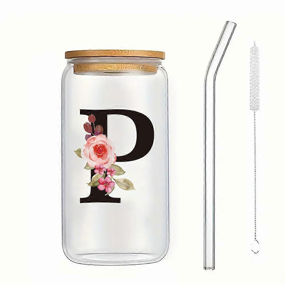 500ML Alphabet Flowers Glass Cups Letter A-X Coffee Water Juice Clear Cup with Lid Straw Brush Valentine's Day Wedding Home Gift