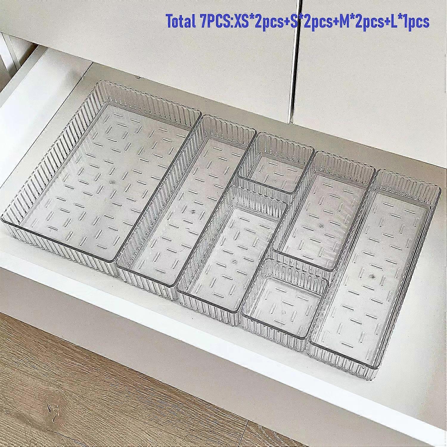 [DETAIL]<br>About this item<br>Make Everything Organized -- These clear versatile drawer dividers trays are perfect for any place in your home. Fit all kinds of drawers, such as vanity / bathroom / kitchen / office drawers/ craft room, ideal for organizing cosmetics, makeup tools, hair accessories, jewelry, pins, office supply, craft supplies, utensils, etc.<br>Combination of 4 Different Sizes<br>Stackable Storage -- The drawer bins can be stacked into one other when you not use them, that will save much space and organize well. You will find it's so easy to keep things neat and tidy.<br>Easy to Clean -- Our desk drawer storage bins are easy to be wiped clean with a damp cloth and perfect for keeping everything in its place. Convenient for use in your daily life, make everything look beautiful and better organized.<br><br>[ATTRIBUTES]<br>- Function: Stackable<br>- High-concerned chemical: None<br>- Shape: Rectangle<br>- Function: Stackable<br>- High-concerned chemical: None<br>- Shape: Rectangle<br>- Feature: Eco-Friendly,Stocked<br>- Use: Jewelry<br>- Style: Modern Style<br>- Material: Plastic<br>- Product: Jewelry Box<br>- Origin: Mainland China<br>- CN: Zhejiang<br>- Type: Storage Boxes & Bins<br>- CN: Zhejiang<br>- Feature 1: Drawer Organizer Set<br>- Feature 2: Vanity Organizer Plastic Tray<br>- Feature 3: Clear Acrylic Drawer Organizer Storage Bins<br>- Feature 4: Makeup organizer and storage for Bathroom