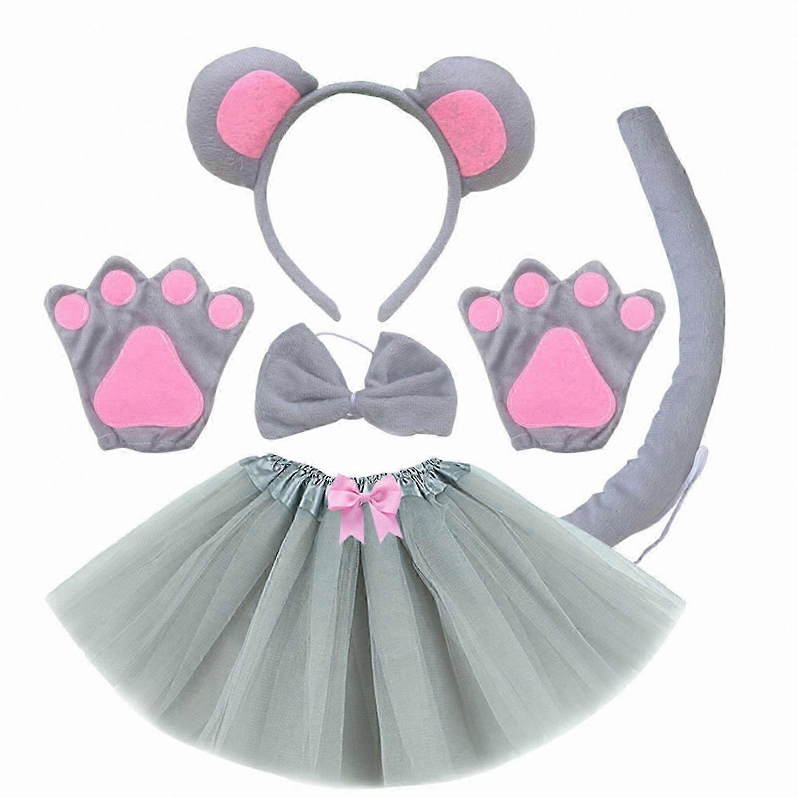 Mouse Costume Set with Ears, Tail, Tutu, Bowtie, Gloves for Kids Halloween Party