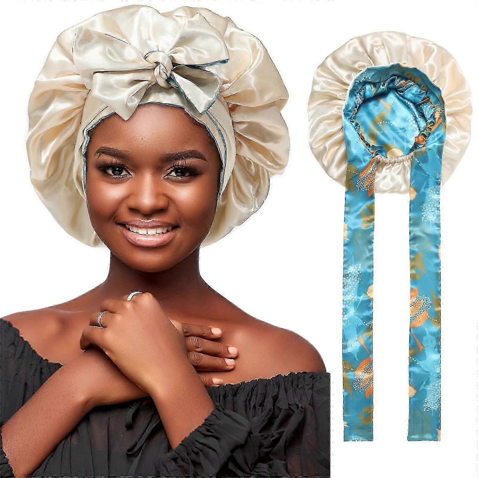 Silk Satin Material - The silk hair wrap for sleeping is made of double-layer 100 percent silk satin,soft and breathable are good for our skin and hair while we sleep. Adjustable Strap Design - Satin bonnet with its strap design and elastic band, our satin bonnet fits comfortably and securely, ensuring that it won't fall off or damage your hair while you toss and turn in bed. Large Size - The sleep cap inner diameter is 21 cm,This hair bonnet is perfect for black women or anyone with long or thick hair, providing ample space to accommodate any hair length or style. Double Layer Design - Our hair bonnet with double-sided color design allows you to switch up your look and match your bonnet with your sleepwear, making it a stylish and versatile accessory for your nighttime routine. Protect your hair - While sleeping with our silk bonnet - the perfect satin hair wrap for sleeping that keeps your hair smooth and frizz-free, allowing you to wake up with silky and healthy-looking hair.