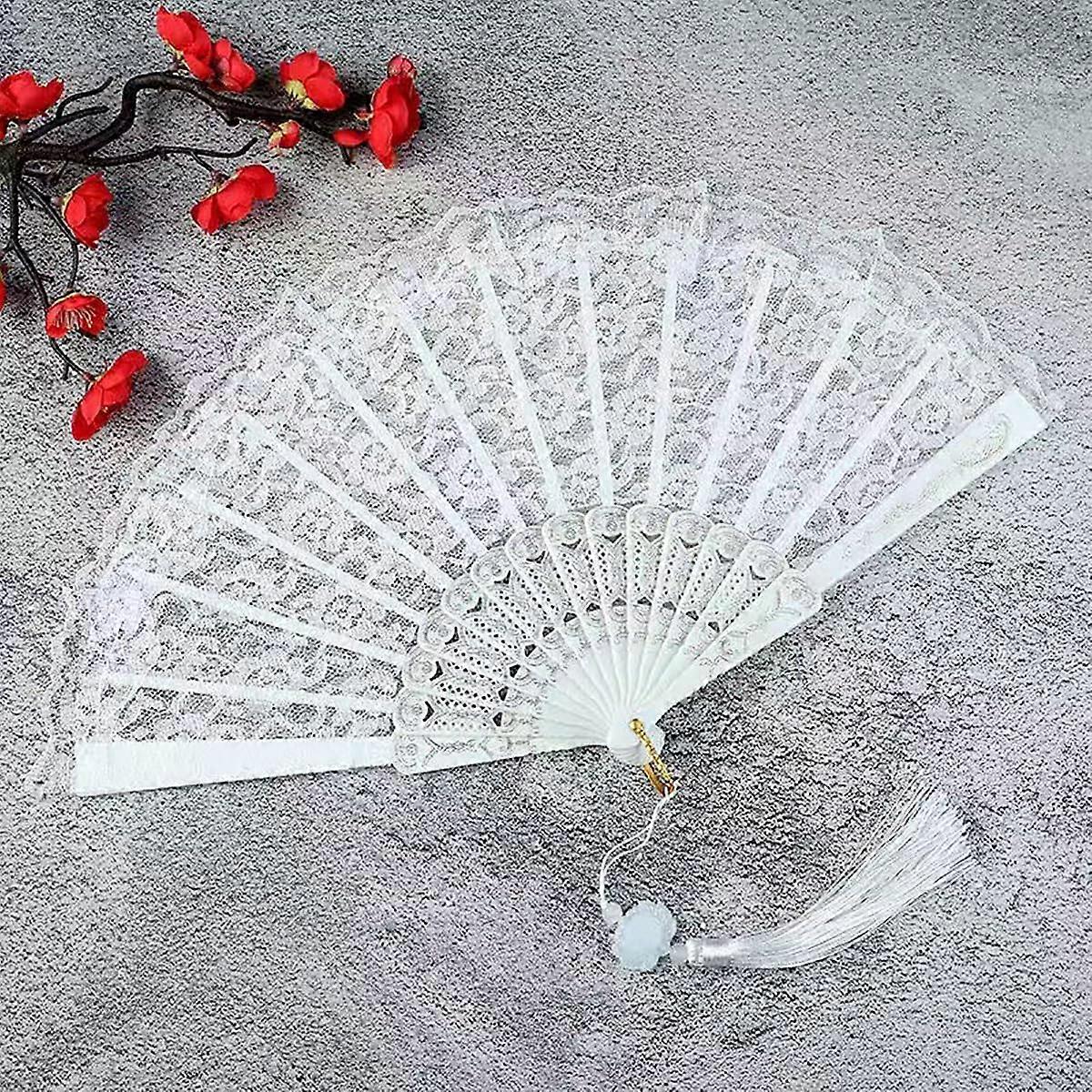 White Vintage Lace Tassel Folding Hand Fan, Elegant Feather Style for Wedding Party Prom Decor
