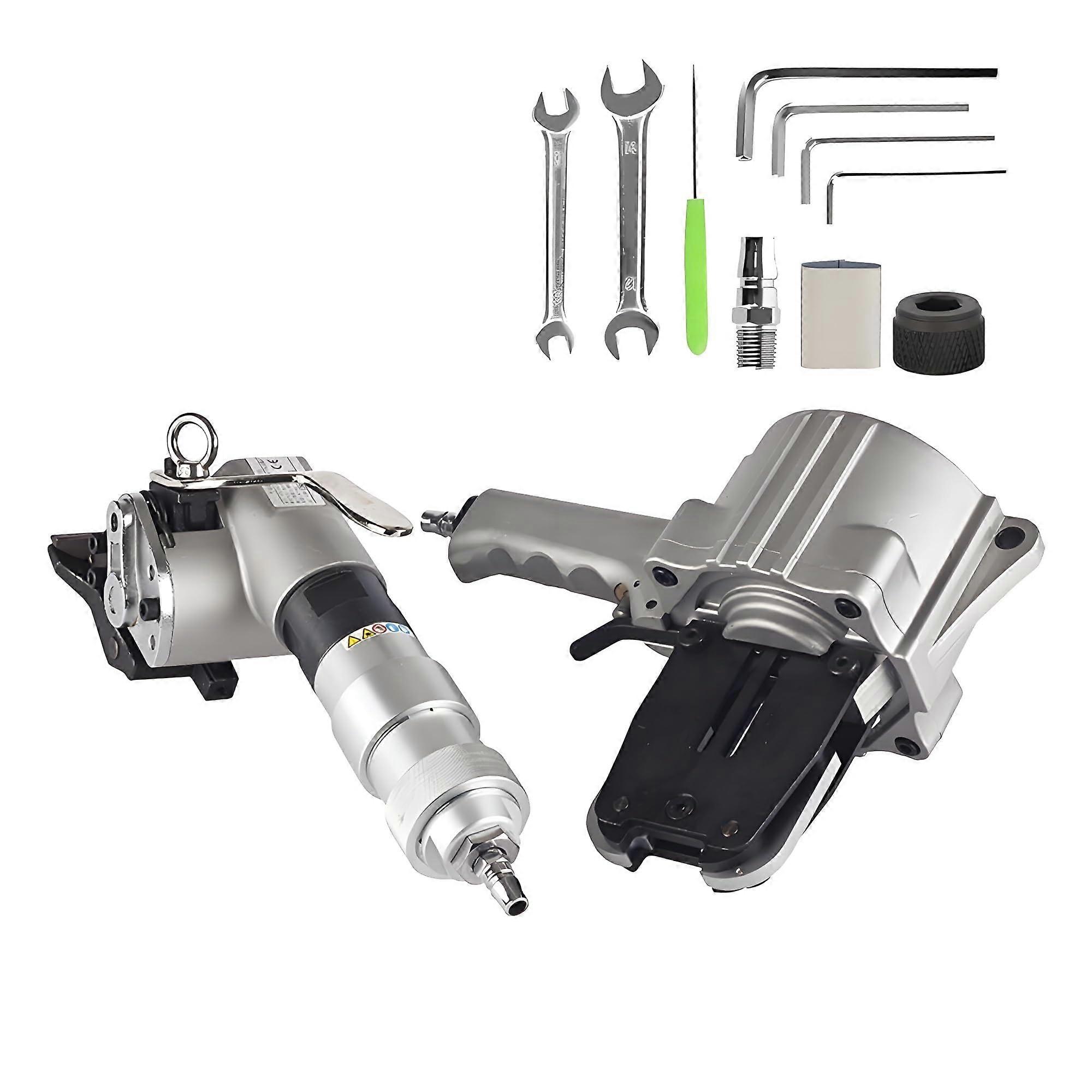 Pneumatic Steel Strapping Machine Set suitable for steel straps including 19 mm Overview This pneumatic steel strapping tool set includes a tensioner and a sealer that work together to tension, seal, and cut steel straps. The split design makes the set flexible for multisite use and reduces storage needs. The tools run on compressed air, eliminating the need for an external electrical power source and reducing physical strain for operators. Key benefits Automates tensioning, sealing, and cutting to speed up packaging and reduce labor intensity strength diecast steel body for durable, dropresistant performance and long service life Split combination design for flexible deployment across locations and easier storage Pneumatic operation provides strong and consistent tension and sealing forces for heavyduty steel strapping Simple operation: rotate tensioner knob to tighten, use sealer to lock the buckle, then cut the strap vertically Main specifications Pneumatic Steel Strapping Tensioner Strap material: steel Operating mode: pneumatic Required air pressure: 0.49 to 0.63 MPa Strap width: 19 to 32 mm Strap thickness: 0.8 to 1.2 mm Tension speed: greater than 3 m per minute Tension: 10 KN at 0.6 MPa Weight: 4.1 kg Pneumatic Steel Strapping Sealer Strap material: steel Operating mode: pneumatic Required air pressure: 0.49 to 0.63 MPa Sealing tension: 15 KN Strap width options: 19 mm, 25 mm, 32 mm (please specify required width when ordering) Strap thickness: 0.8 to 1.2 mm Sealing method: metal buckle Seal type: singleclamp buckle Weight: 3.1 kg Performance and usage notes Pneumatic components must be connected to a stable compressed air source at 0.49 to 0.63 MPa. Insufficient air pressure will reduce performance. The tensioner features an imported vane motor for steady tensioning. Turning the rotary knob feeds and tensions the strap automatically. The sealer uses a power cylinder to generate strong locking force for secure buckles. The tool cuts the steel strap vertically for a clean finish. The compact, solid metal construction handles heavyduty strapping demands while remaining easy to carry and store. Typical applications Bundling steel pipes, bars, and profiles for transport and storage in metal fabrication shops Securing coils, plates, or other heavy steel products during and logistics Strapping construction materials such as rebar or bundled components on site for handling and transport What to specify when ordering Required strap width option: 19 mm, 25 mm, or 32 mm This pneumatic steel strapping machine set provides a robust, pneumatic solution for consistent, heavyduty steel strap tensioning and sealing in industrial and construction environments.