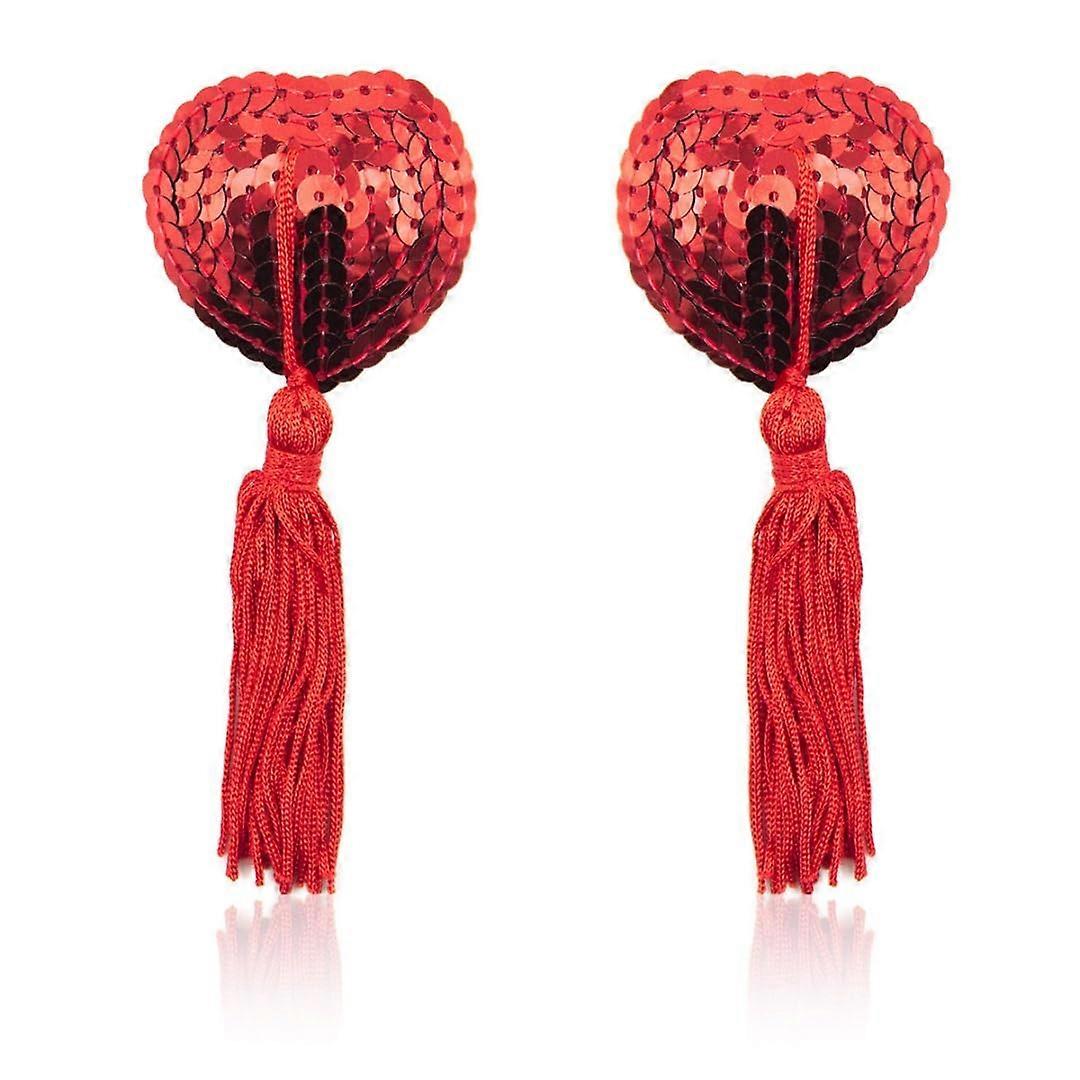 Reversible Sequin Heart Pasties with Tassels Red Reusable Adhesive Nipple Covers for Women