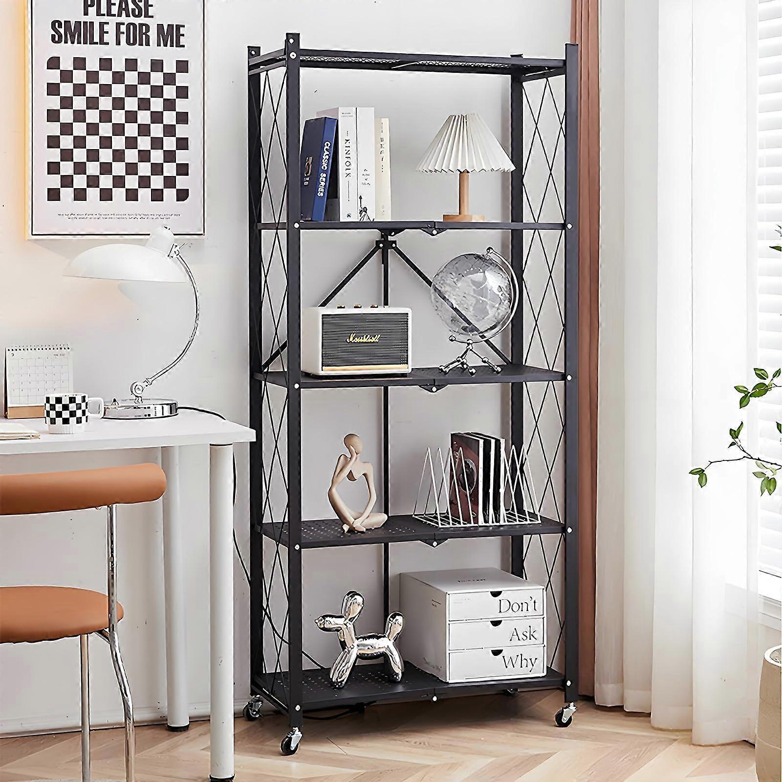 5Tier Folding Storage Shelves, HeavyDuty Metal Shelving Unit with Lockable Wheels for Kitchen, Pantry, Office – Black