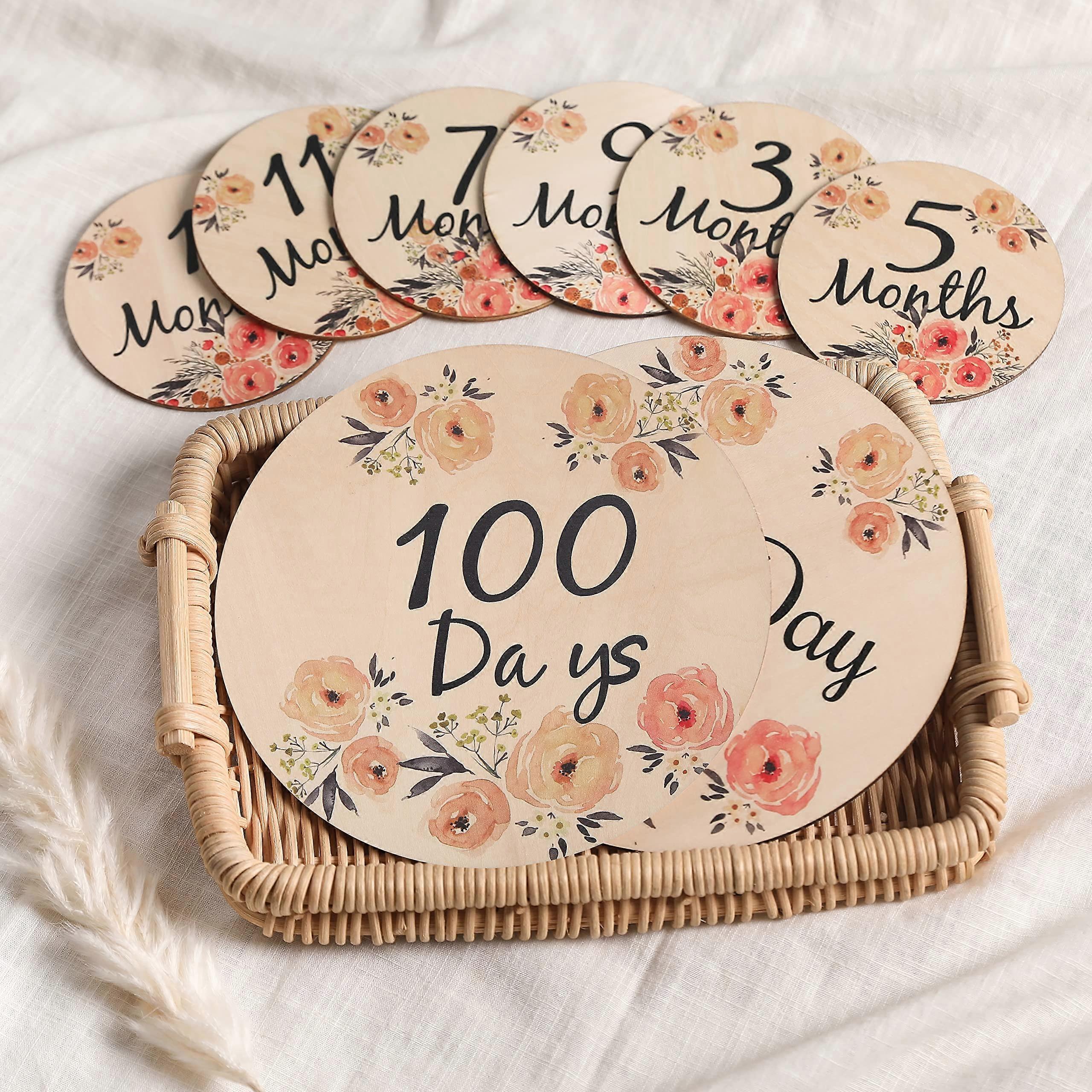 Wooden Baby Teether and Monthly Milestone Cards Set with Flower Design Photo Props