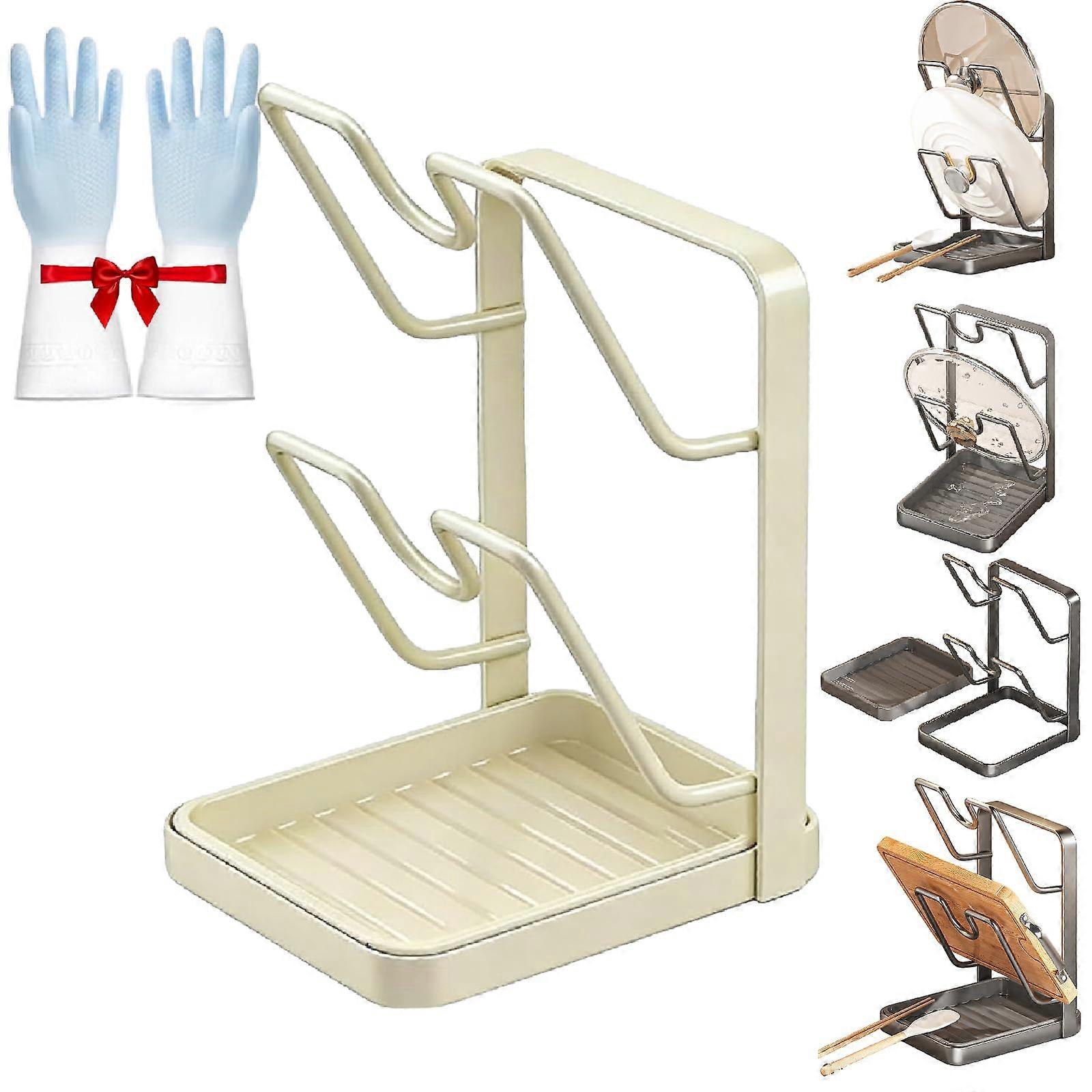 Pot Lid Holder 2PCS Stainless Steel Lid Organizer with Spoon Rest and Removable Drip Tray White