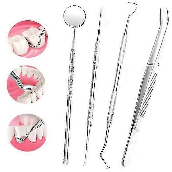 professional and practical kit: Made with stainless steel, this professional dental hygiene kit for the best possible dental care at home. Prevent the formation of tartar by removing plaque. Use it regularly to combat bad breath. 4 instruments in the package: This kit contains the same type that the dentist uses in surgical stainless steel, a scraper with two ends, forceps and a mirror as shown in the picture. Get a better look inside the mouth with the mirror so you can easily see tartar sitting on the back or front of the teeth. Proactive dental care: Think preventively and minimize expensive dental bills! Multifunctional dental hygiene kit: May also be needed for dental care in pets. The package includes: 1x Mouth mirror 1x scraper with 2 flat scrapers 2x scrapers with different pointed scrapers Important! Remember to always sterilize the tools both before and after use to avoid the spread of bacteria. NOTE: For hygiene reasons, it is NOT possible to return or exchange products if the packaging is broken.