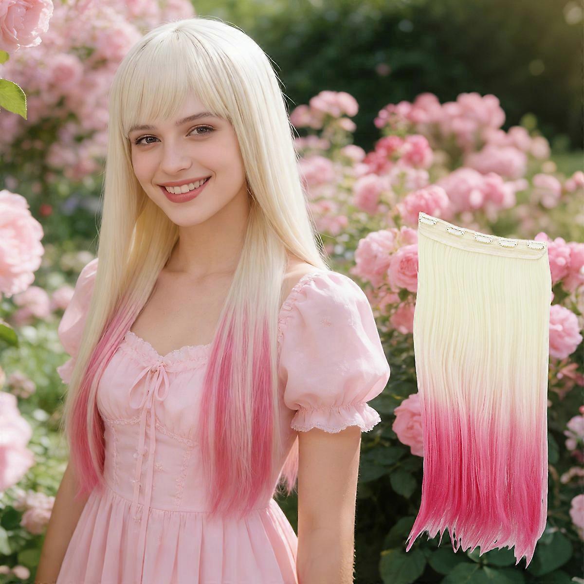 Women's 66cm five-clip hair extensions, one-piece seamless invisible long hair in gold, pink, and blue gradient colors.
