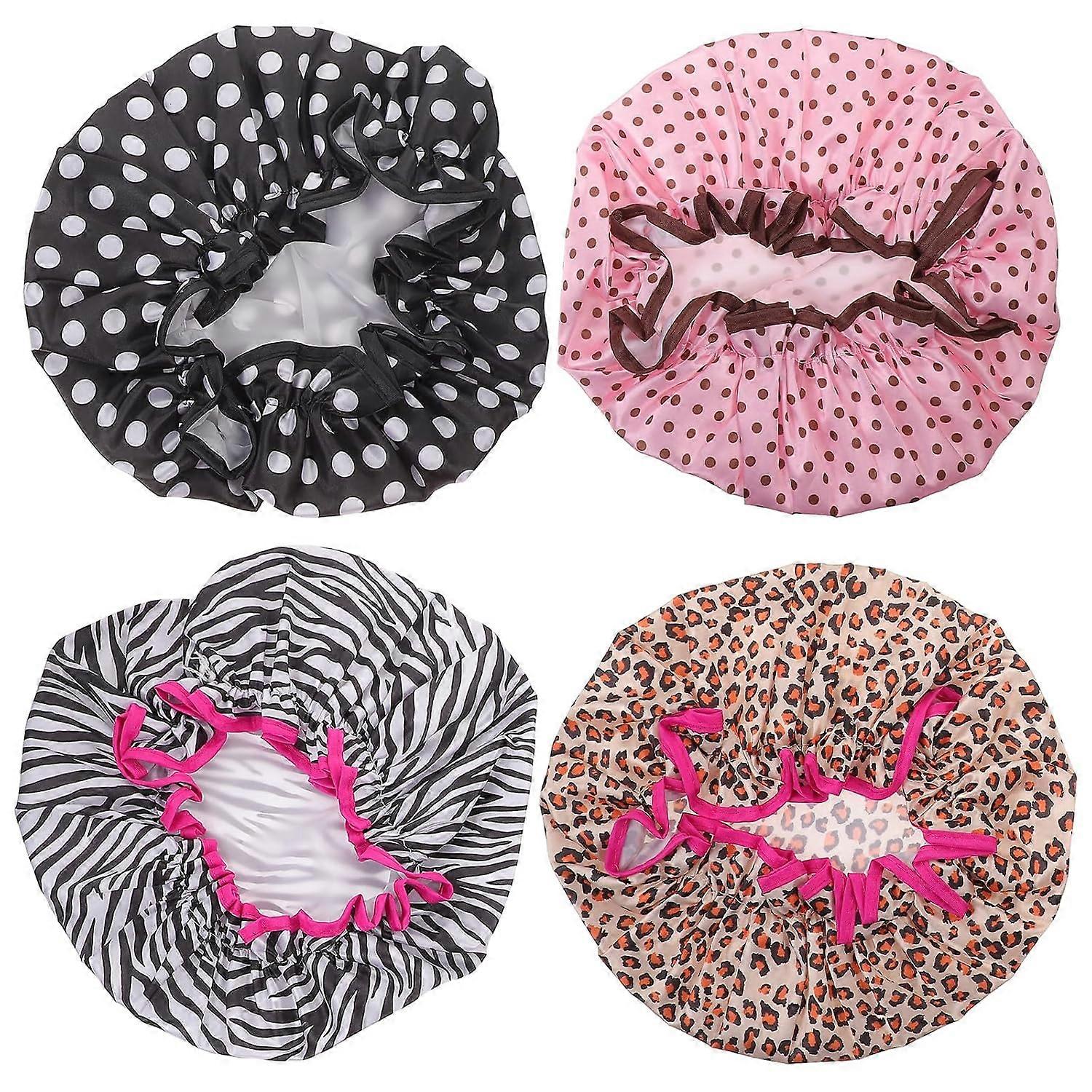 Waterproof Reusable Shower Caps for Women 4Pcs Double Layer Bathing Caps Elastic Band for Hair Protection in Bathing, Kitchen, and Makeup Use