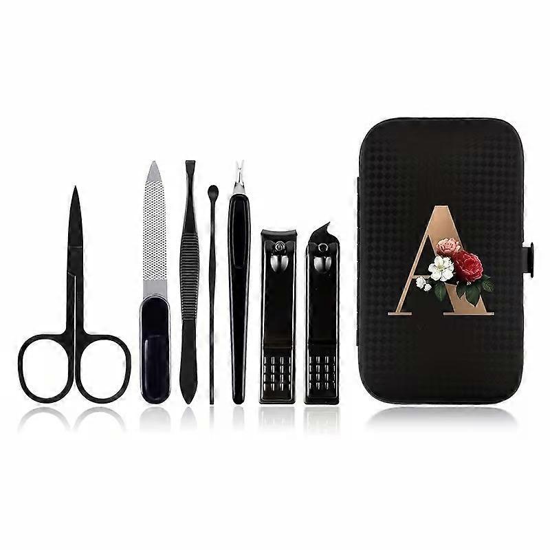 7-piece nail scissors set with 26 letters, including a portable travel case and a pedicure scissors set.