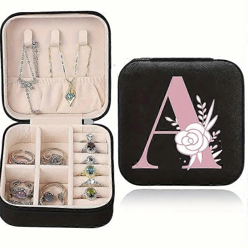 Portable jewelry box with letter and floral pattern for storing necklaces, rings, earrings, and studs.