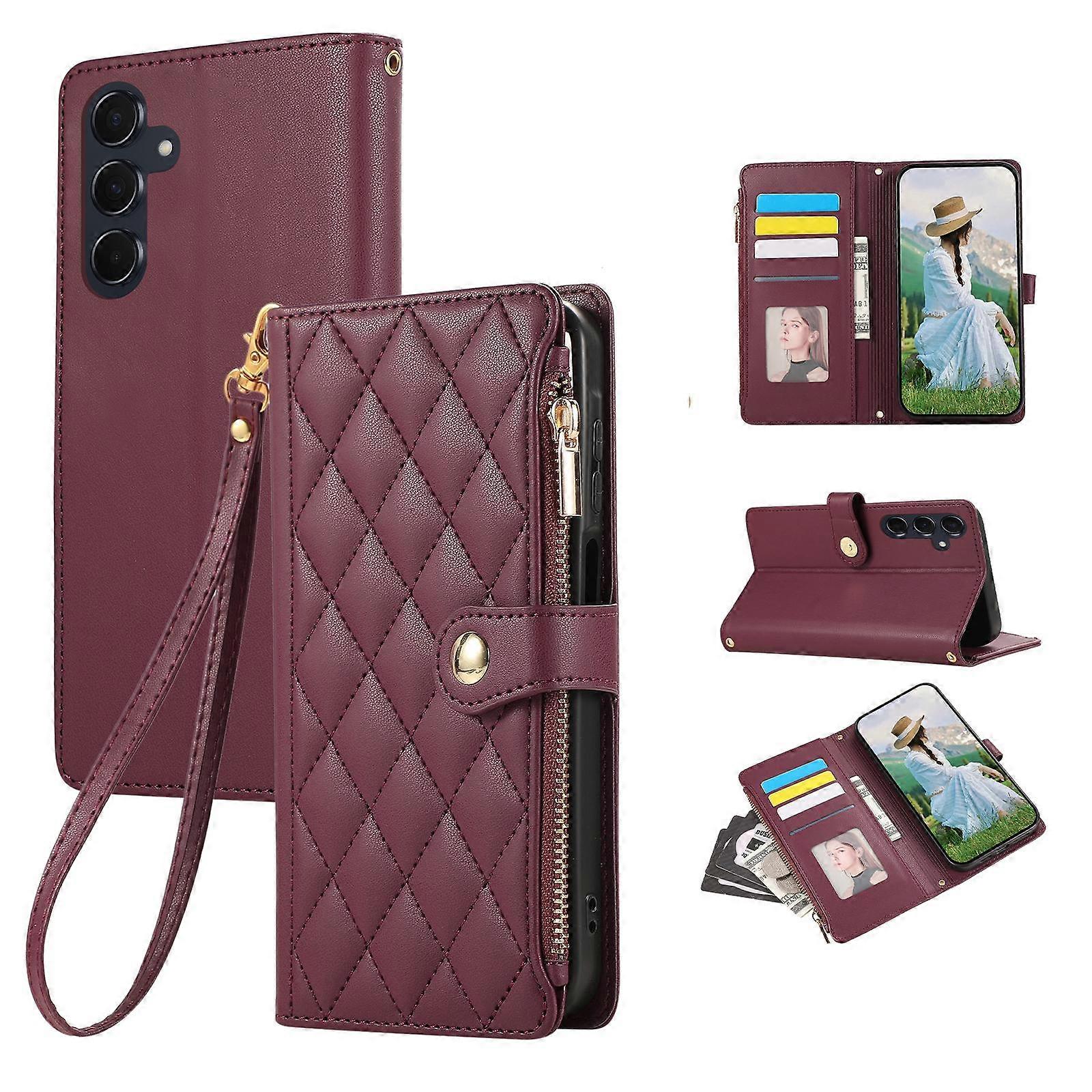 For Samsung Galaxy A57 5G Case Multi Card Slots Zipper Rhombus Leather Phone Cover with Wrist Strap