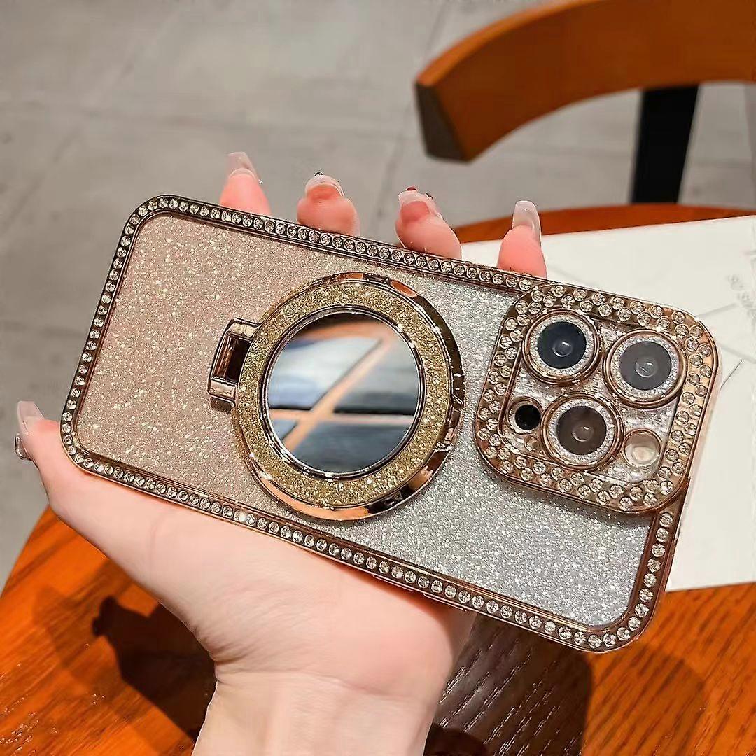 Magnetic stand compatible with iPhone 15 gradient glitter phone case, 14 Pro electroplated rhinestone 13 protective case with diamond inlay.