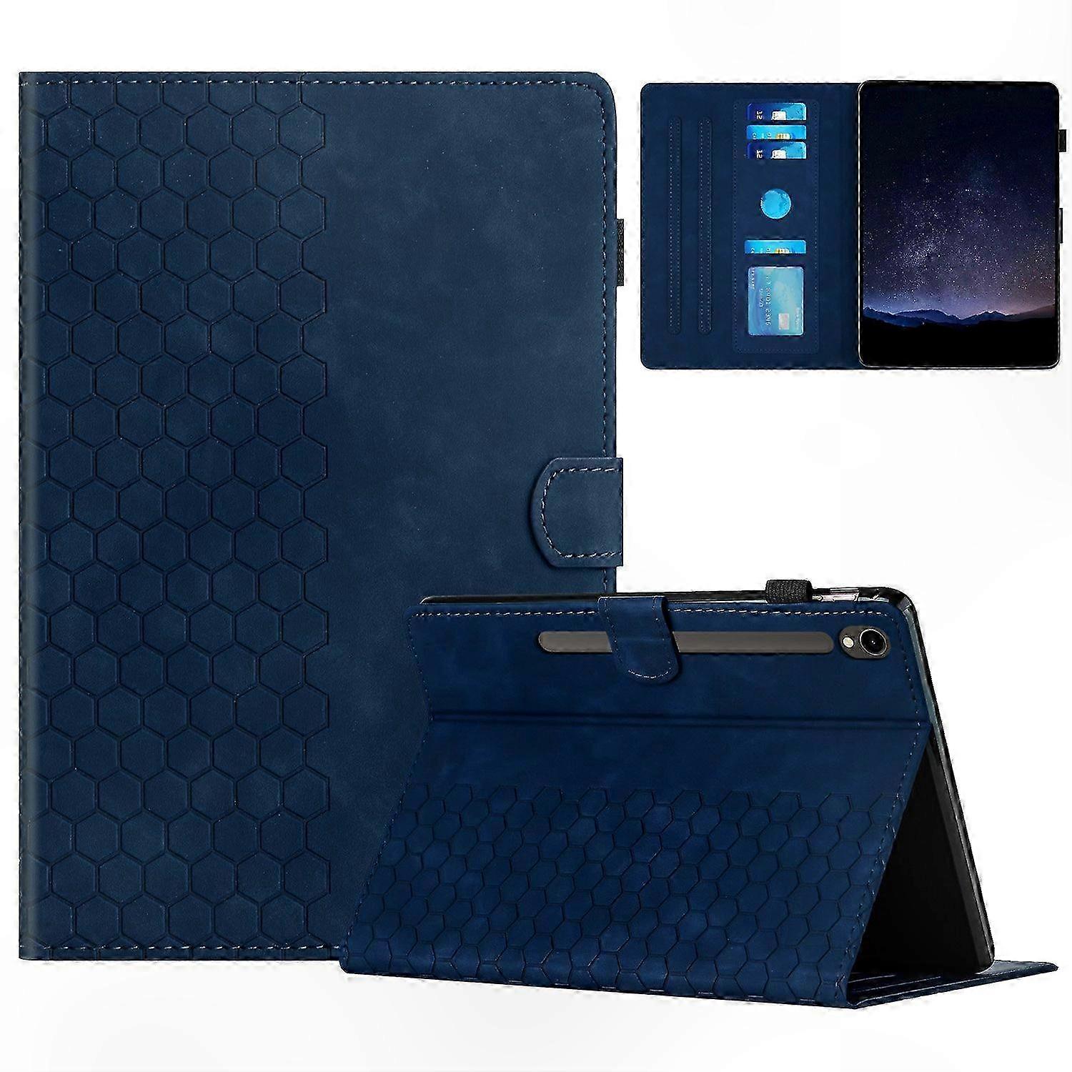 Premium Material: Made from high-quality PU leather with a TPU inner case for excellent protection Stylish Pattern Design: Features a honeycomb pattern for a modern look Adjustable Viewing Stand: Adjustable stand with two support stripes for comfortable viewing and typing angles Magnetic Clasp: Dual-sided magnetic closure keeps the case securely closed Card Holder: Built-in slots for up to 3 cards and 1 photo Stylus Storage: Side elastic loop for convenient stylus storage (stylus not included) Auto Sleep/Wake Function: Built-in magnets enable automatic sleep and wake functionality to conserve battery Compatible with: • Galaxy Tab S9 • Galaxy Tab S9 FE • Galaxy Tab S10 FE Package Includes: • 1 x Tablet Case