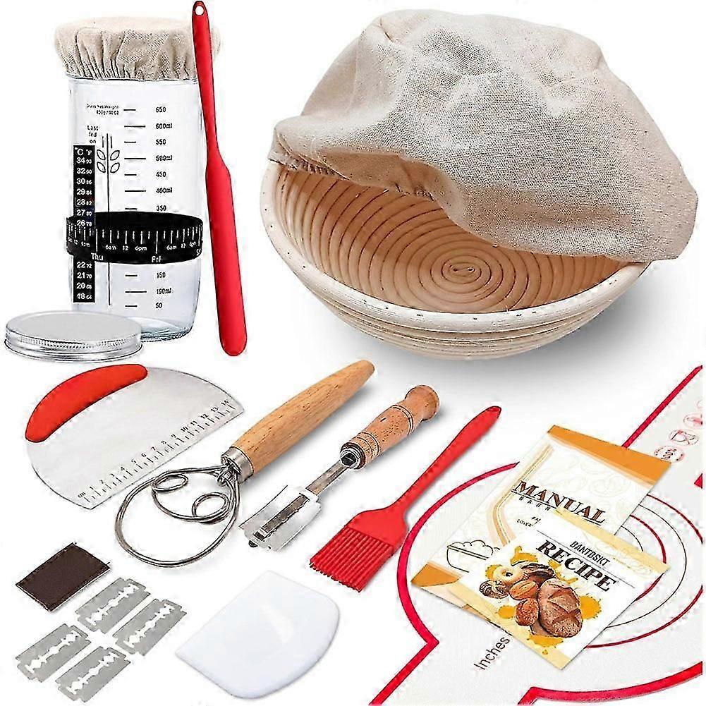 Comprehensive Baking Supplies: This kit includes a Sourdough Starter Container, a 9" Bread Proofing Bowl, and all essential baking tools required to craft delicious, nutritious homemade sourdough bread. A printed recipe book and user manual are also provided for your convenience. 24 oz Sourdough Starter Jar: With a 24 oz capacity, this jar is perfect for making 2-4 sourdough loaves. Its wide-mouth design facilitates easy addition of flour and water, and simplifies the removal of the starter as needed, enhancing your baking experience. Ideal Gift for Bread Lovers: Whether you're a seasoned baker or a beginner, this kit contains all necessary tools for baking sourdough bread. It's an excellent way to enjoy baking with family and friends, making it a perfect gift for any bread enthusiast. Banneton Bread Proofing Basket: Crafted from natural Indonesian rattan, our basket stands out in the market for its smooth finish, lack of splinters, and resistance to mold, ensuring safety and durability. Remember to dust with flour before use to prevent sticking. Easy Cleanup Process: Maintaining this kit is effortless. After use, a simple pat or brush can remove any remaining flour. The jar features a clear writing scale; however, avoid using citrus-scented dish soaps to preserve the markings. Color: As Shown Material: Rattan Package Contents: 1* bowl scraper 1* silicone brush, 1* dough scraper, 1* dough beater, 5 bread blades, 1* silicone mat, 1* round dough bowl with cloth, 1* proofing container 1* mixing stick.