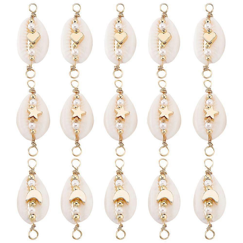 15pcs 3 styles Natural Cowrie Shell Shell Pearl Links Shell Shaped Connector Charms with Brass Heart/Star/Moon Beads Snow 32~35.5x13~15.5x9.5~11.5mm H