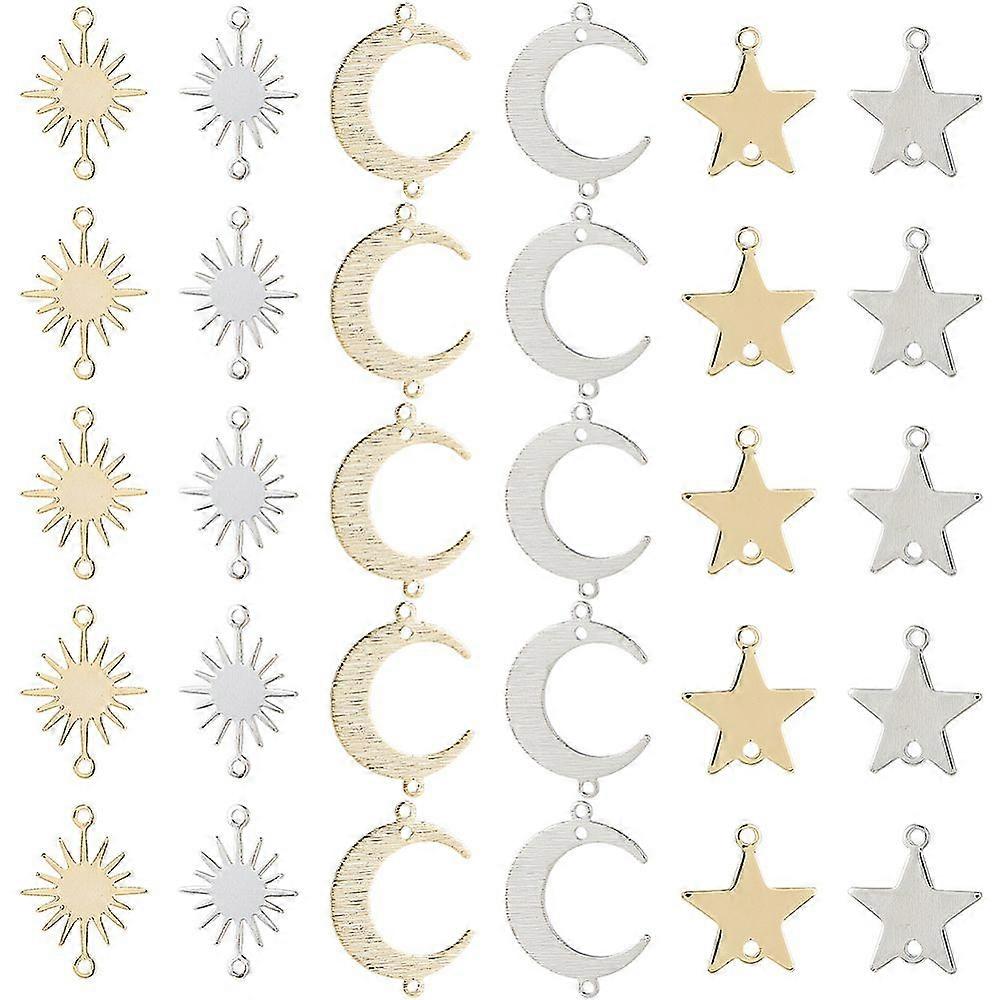 30pcs 6 styles Brass Link Connectors Long-Lasting Plated Sun Moon Star Mixed color 16.5~18x12~22x0.5~1mm Hole: 1.2mm 5pcs/style