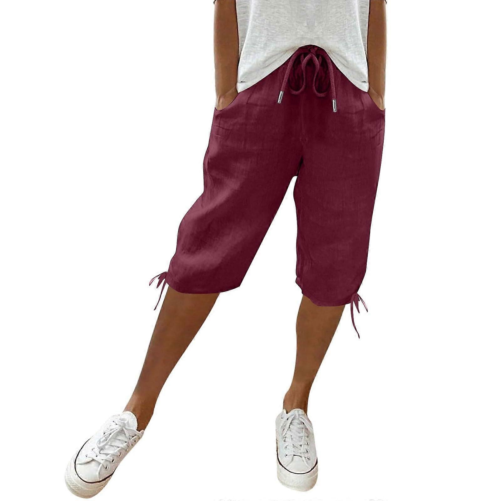 Women's Linen Shorts Wide Leg High Elastic Knee Length Cotton Linen Shorts with Pocket Burgundy XL