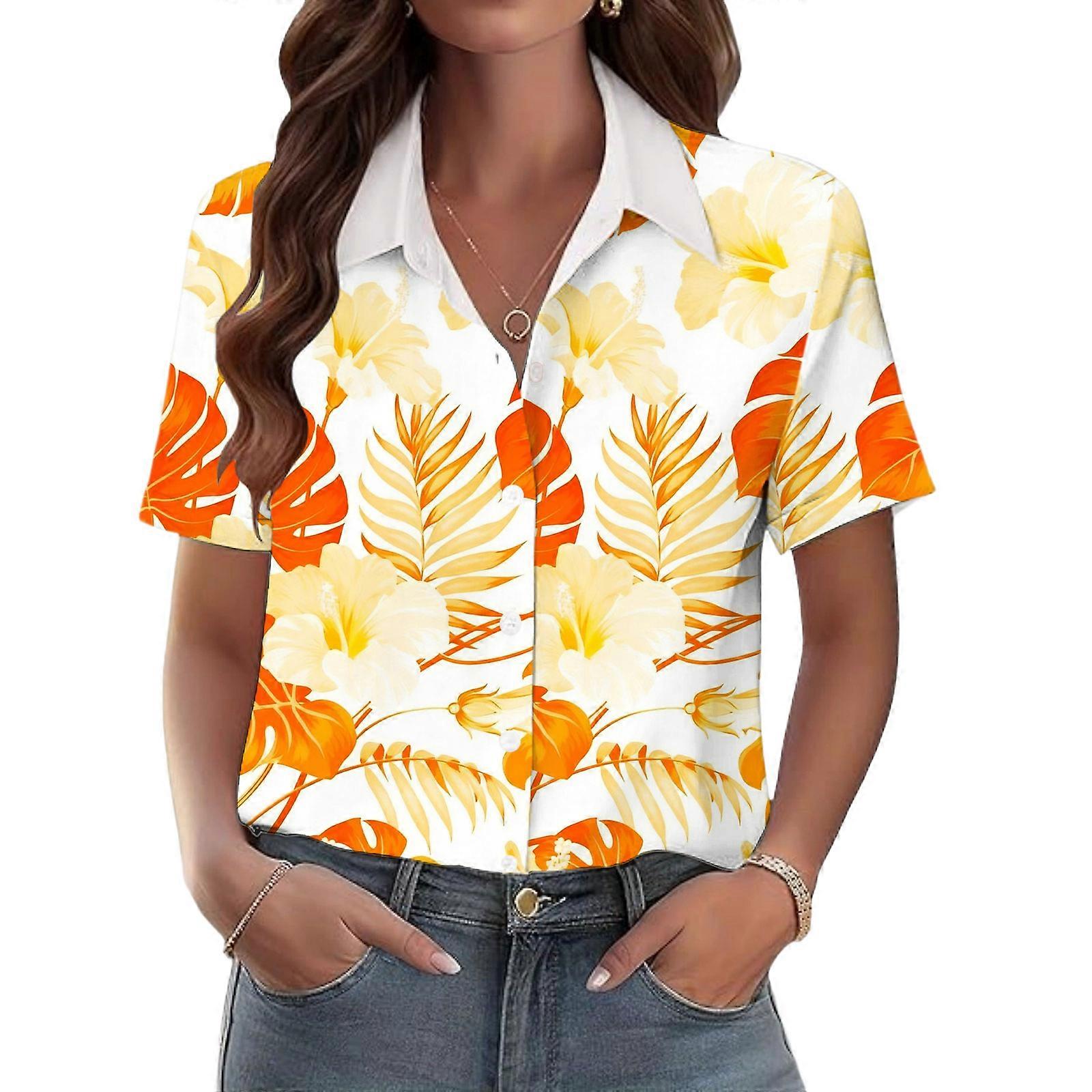 Women's V-neck short-sleeved shirt, casual positional print top, vacation shirt Yellow XL