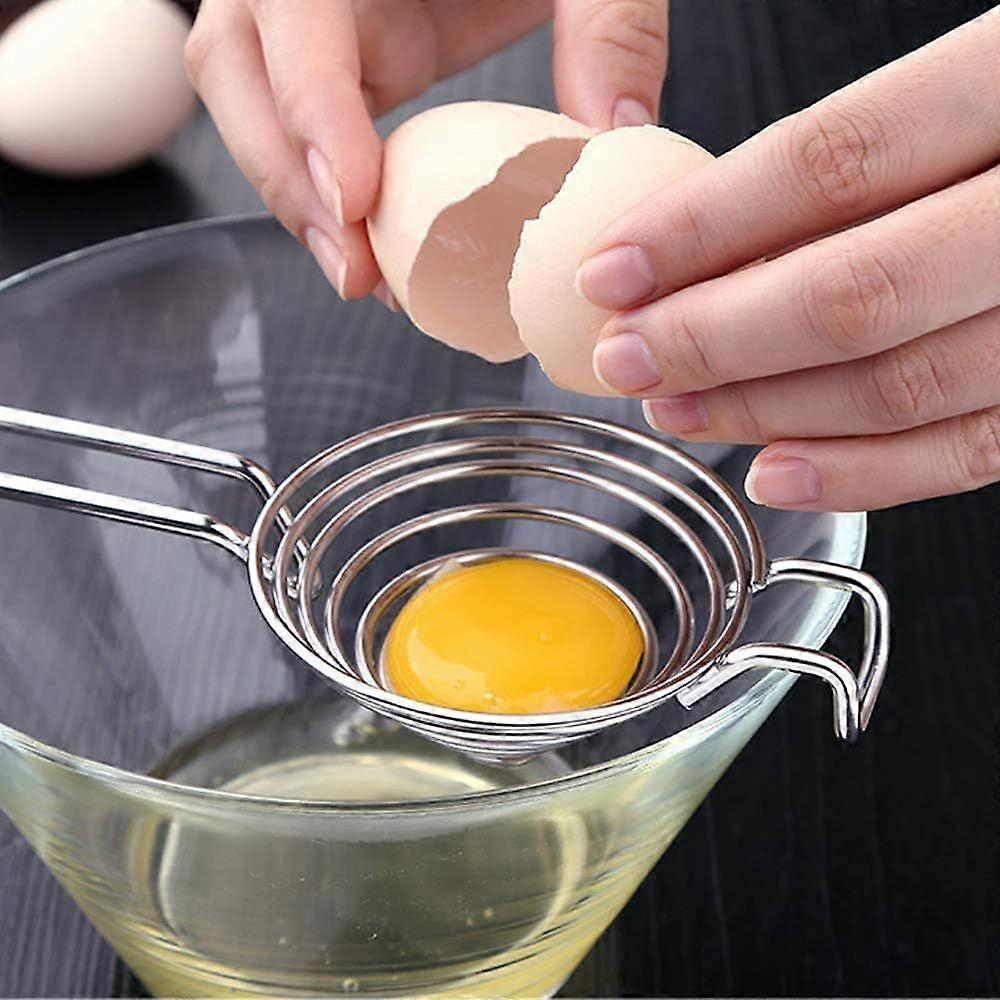 INSTANT & COMPLETE SEPARATION EGG YOLKS: The spiral structure of the egg divider allows the egg white to be filtered instantly. The spring coil with just the right spacing will keep you from losing any egg yolk. that works with normal size egg or jumbo eggs, improve cooking efficiency. . FUNCTIONAL DESIGN: The egg sieve with hook fits any size bowl, no more worry about getting your hands messy and no eggshell pieces went into the bowl. Non-slip handle design makes grip more comfortabel,more stable when use. . FOOD GRADE STAINLESS STEEL: it is made of high-quality 304 steel that can be safely used for food contact of outstanding performance in durability and corrosion resistance. . An essential kitchen gadget to have when you are making muffin, chiffon cake, key lime pie, crepes,meringue, diet food and more.