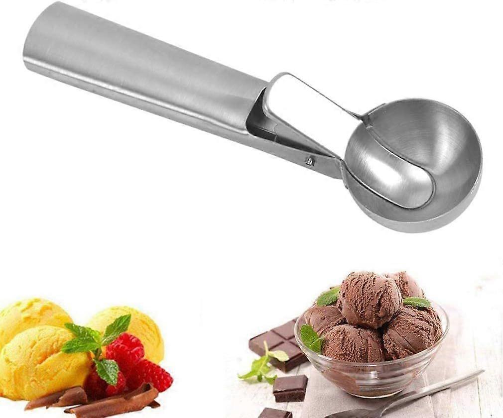 The ice cream scooper comes with a thick, ergonomically crafted handle that offers great grip and superior scooping comfort.Dimension:18.2*4.9*4.6cm. . Stainless steel ice cream scoop are stain-resistant, and will not easily rust, corrode, or broken. These cookie scoop retains its gleaming shine after dishwasher wash. . Just lift spoon into the ice cream and pickup some of ice cream and then push the button, you can see ice cream fall into your plate. Suitable for children and adults. . When youre done scooping easy, just toss your scoop in the dishwasher for an easy clean. Just flip it over to run water to clean it thoroughly from the bottom to clean thoroughly underneath the lever. .