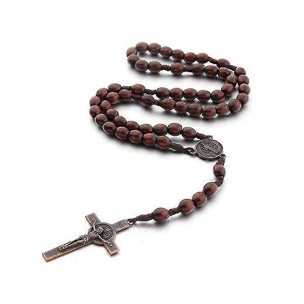 Rosary necklace with Catholic cross, natural wood prayer beads