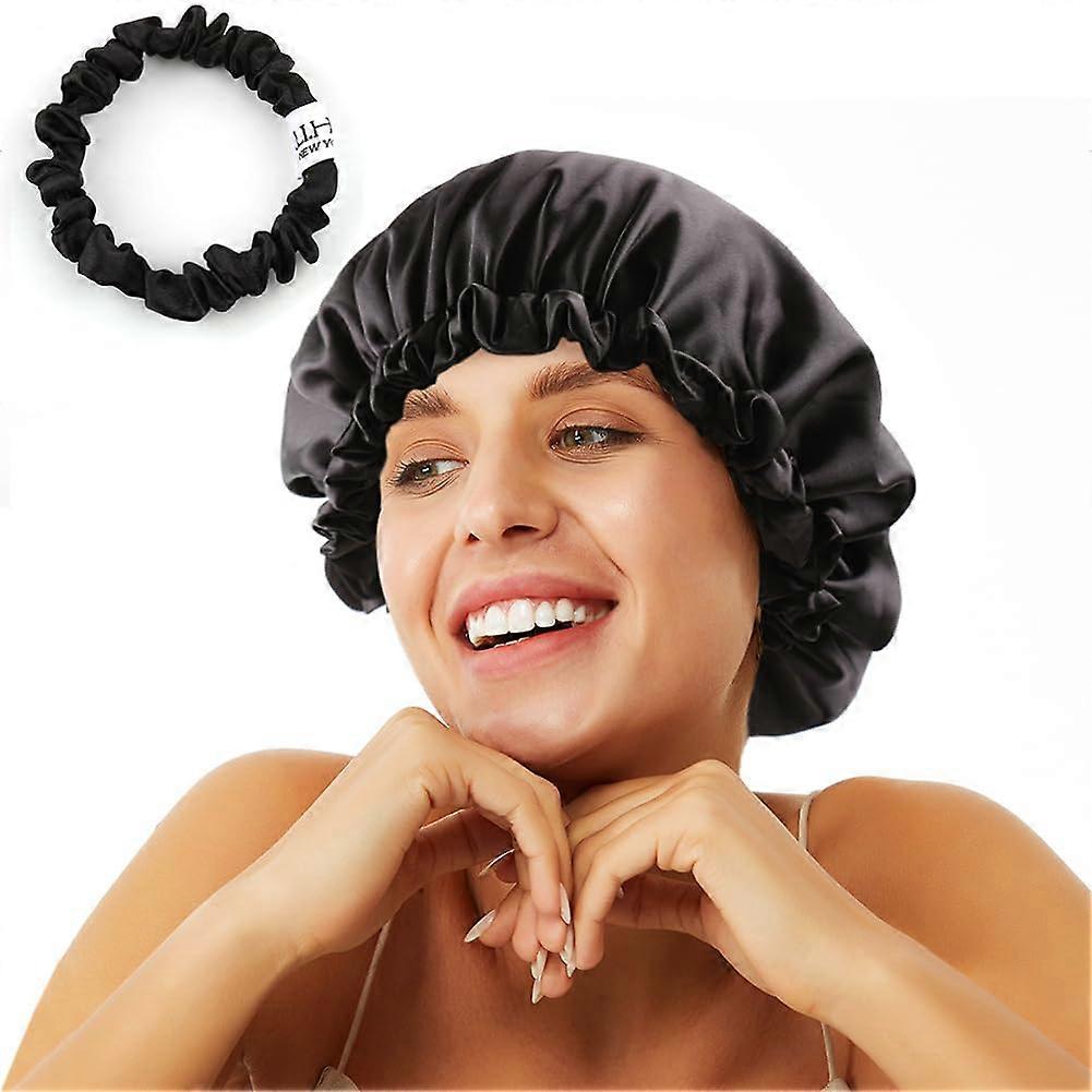 Stain Bonnet Silky Sleep Cap Adjustable Satin Cap for Night Sleeping Hair Bonnet Reversible Double Layer Jet Black
