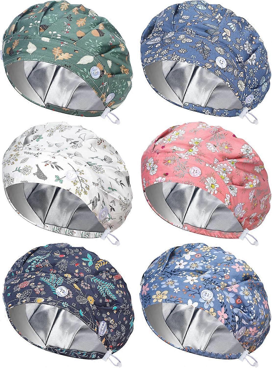 6 Pcs Satin Lined Scrub Caps Women Nurse Surgical Hat with Buttons Ponytail Working Adjustable Pouch Tie Back(Classic Style;Random color)