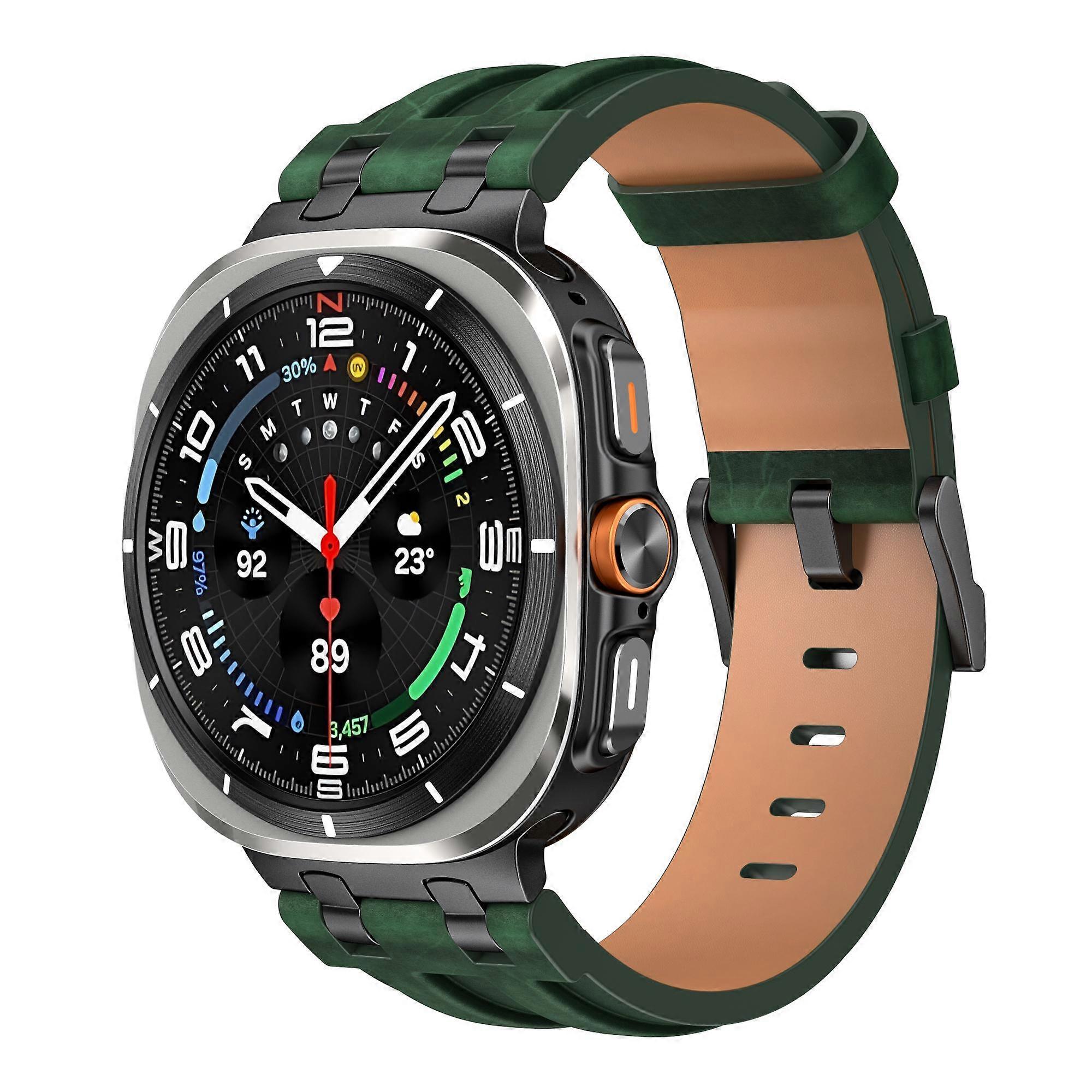 •【Crazy Horse Texture Design】Features a retro-inspired crazy horse texture surface that develops a unique vintage look over time, adding character and style to your watch. •【PU Leather Material】Made from high-quality PU leather with a soft inner lining, providing a comfortable wearing experience while maintaining a classic leather appearance. •【Stainless Steel Buckle】Equipped with a durable 304 stainless steel buckle for secure fastening, offering reliable performance and a refined metallic finish. •【Retro & Versatile Style】Classic retro design pairs well with both casual and business outfits, making it a stylish replacement strap for everyday wear. •【Wrist Size Compatibility】Designed to fit wrist circumferences from 175mm to 230mm, with multiple adjustment holes for a personalized and comfortable fit. Specifications: •Material: PU + 304 Stainless Steel •Length: 131*82*21mm •Wrist Circumference: 175-230mm Compatible with: •Galaxy Watch6 Classic 47mm •Galaxy Watch Ultra 47mm •Galaxy Watch Ultra (2025) 47mm Package included: •1 x Watch Strap •Other items not included