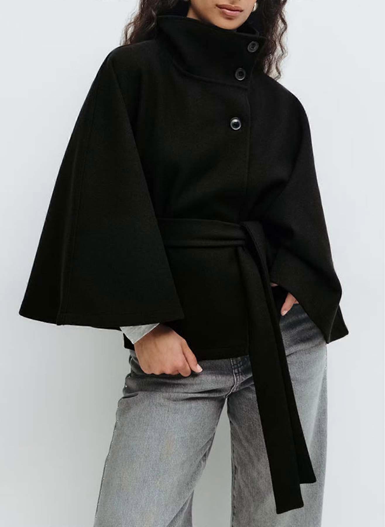Women's Autumn And Winter Fashion Solid-Color Cape Stand-Up Collar Button Belt Trench Coat