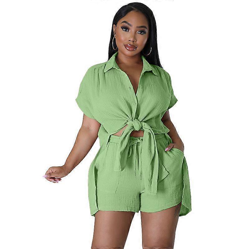 Summer Reversible Collar Shirt And Casual Pants Set For Women, With Ins-Style Elastic Waistbands