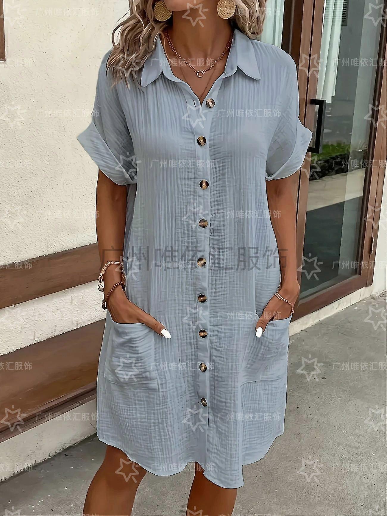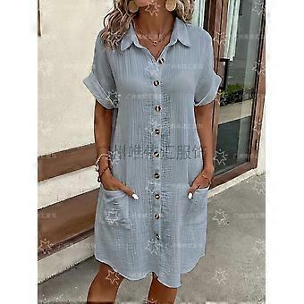 Casual Plain Cotton Linen Shirt With Buttoned Collar, Medium-Length Short-Sleeve Design, Loose Fit For Women