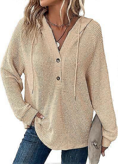 Women's Waffle Knit Drawstring Buttons V-Neck Long Sleeve Hoodie