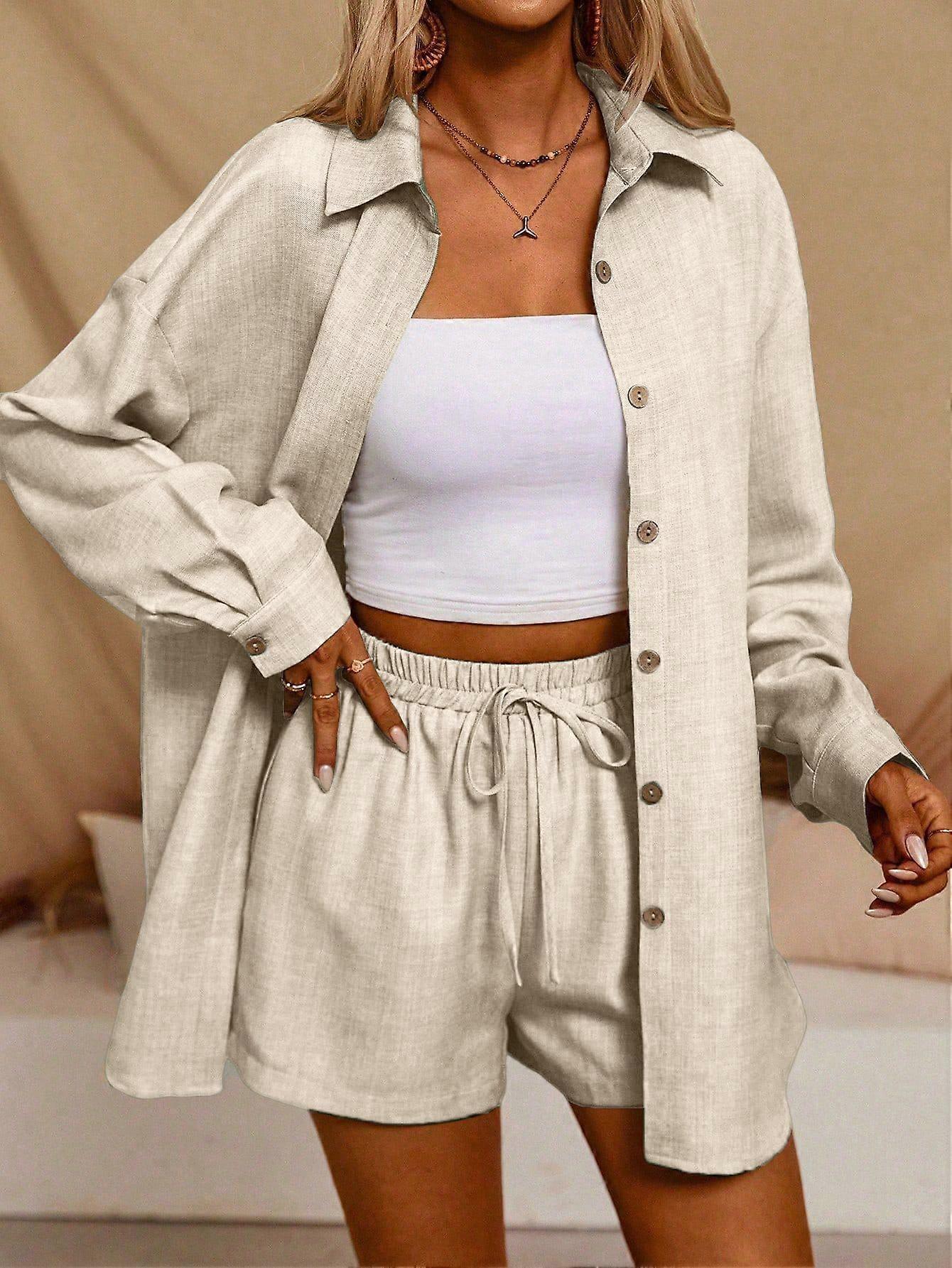 Women's Summer Solid Color Lapel Long Sleeve Shirt Elasticated High-Waisted Shorts Lace-Up Casual Set