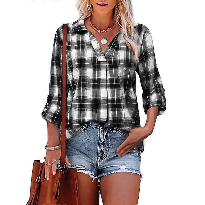 2026 Spring/Autumn Women's Long-Sleeved V-Neck Collar Shirt With Flared Plaid Design