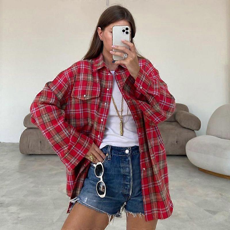 Laid-Back Spring Style: A Versatile Plaid Shirt With Turned-Down Collar For Work And Casual Wear