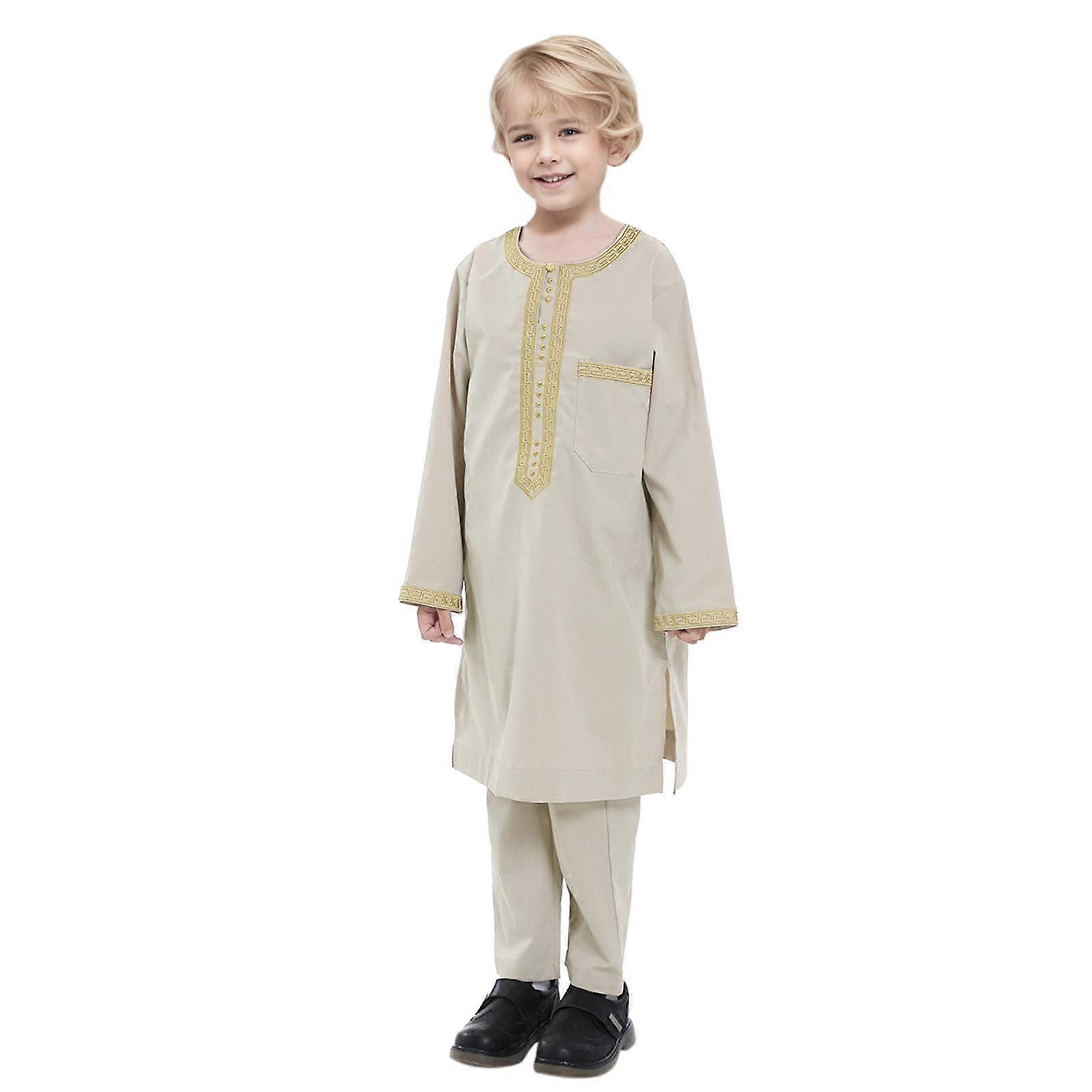 Muslim Boys Thobe Embroidered Long Sleeve Arabic Robe Beige Outfit 910 Years Soft Breathable Fabric