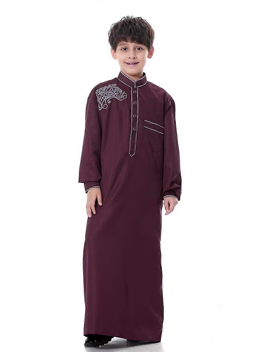 Muslim Boys Thobe Stand Collar Embroidered Kids Islamic Robe Wine Red Long Sleeve S3XL
