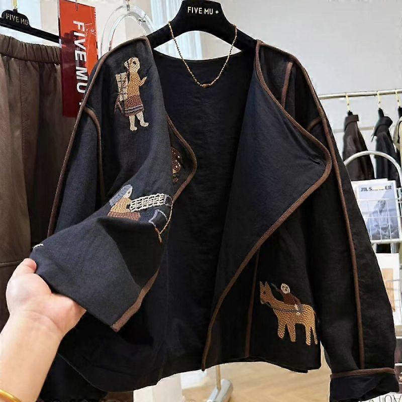 Autumn Clothes, High-End Linen Heavy Industry Embroidery Crew Neck Cropped Jacket, Huge Good-Looking, Loose Jacket Top Girl
