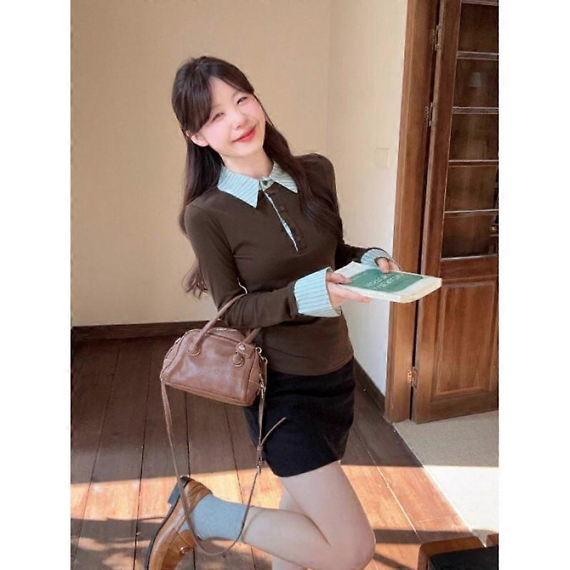 Autumn And Winter Maillard Patchwork Plaid Lapel Long Sleeve T-Shirt Women's Autumn Slim Slimming Versatile Top