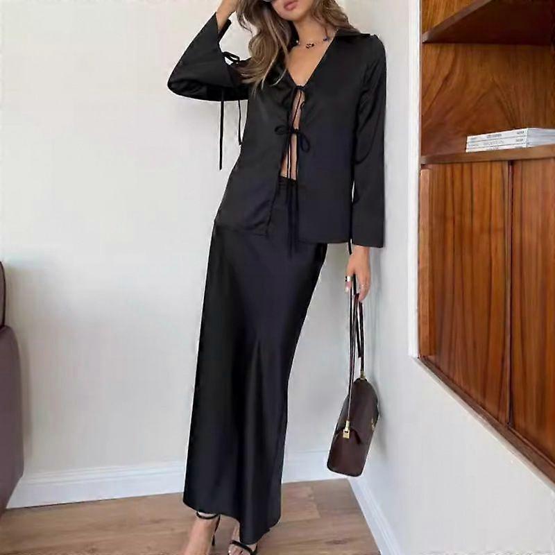 Main Fabric Component:Polyester (Polyester Fiber) Fabric Name:Polyester Suit Style:Skirt Suit Style:Commute Process:Collage/Assembled Trendy Element:Ties Sleeve Length:Long Bill No.:78090 Pattern:Solid Skirt Length:Long Skirt Main Fabric Component 2:Polyester (Polyester Fiber) Color:Black, Weight: 393G, Material: 100% Polyester Fiber Size:S,M,L Style Type:Chic Commute Main Fabric Component Content:95% Or Above Style:Comfortable And Casual Sleeve Type:Standard Sleeve Check Availability:Ye