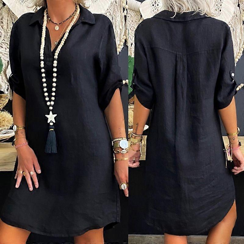 Autumn Nordic Style Cotton Short-Sleeved Shirt Dress Loose Long Skirt Solid Color Plus Size Dress