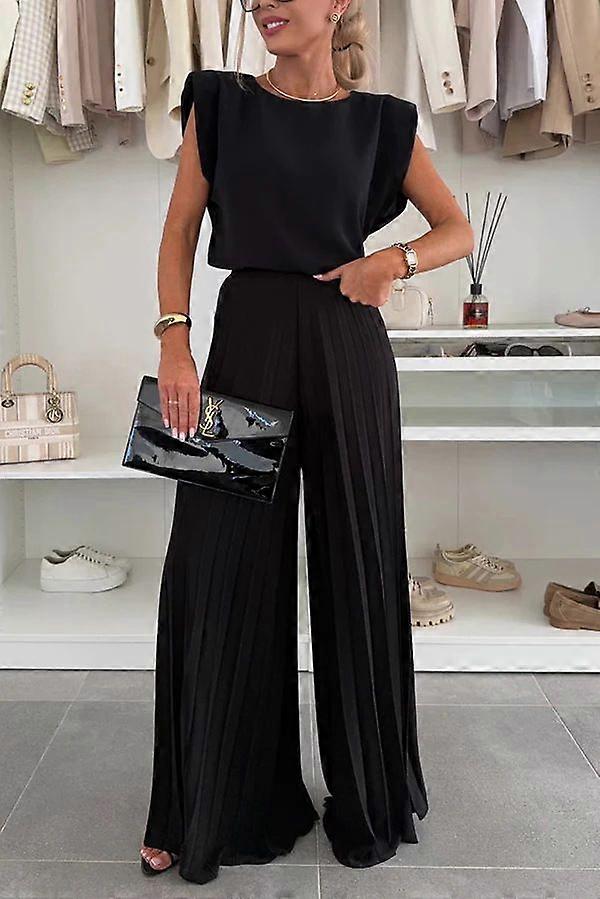 Women's Fashion Set: Round-Neck Sleeveless Top, Pleated Wide-Leg Pants, Two-Piece Casual Set