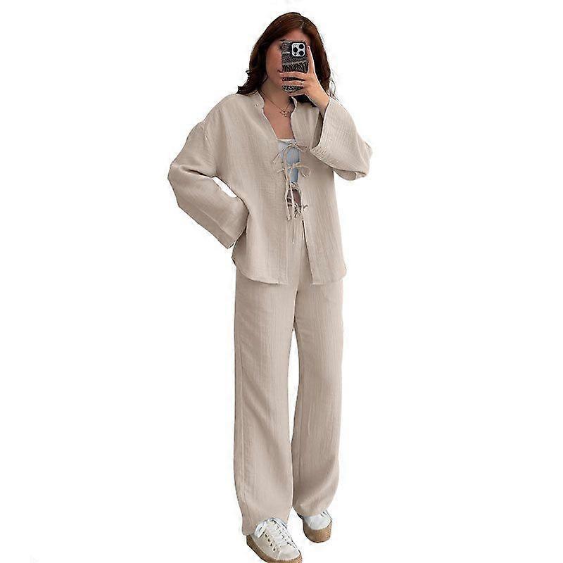 Summer-Autumn Solid Color Lace-Up Cardigan Long-Sleeved Women's Fashion Casual Trouser Set