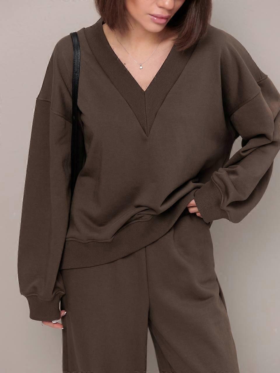 Women's Long-Sleeved Loose Casual V-Neck Solid Color Sweatshirt Top Wide-Leg Trousers Two-Piece Set