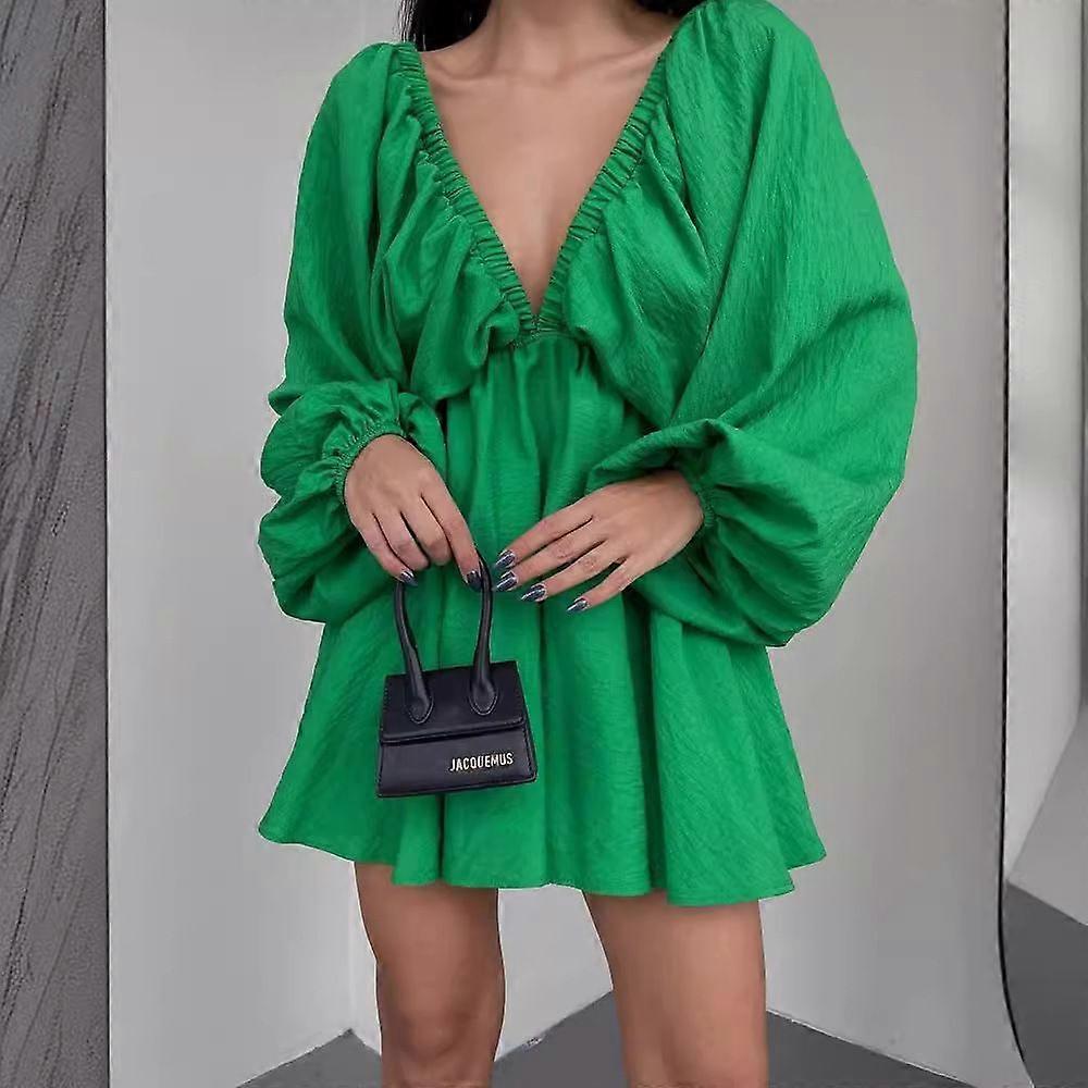 V-Neck Long-Sleeved Dress With Self-Designed Bubble Sleeves And A Wide Skirt